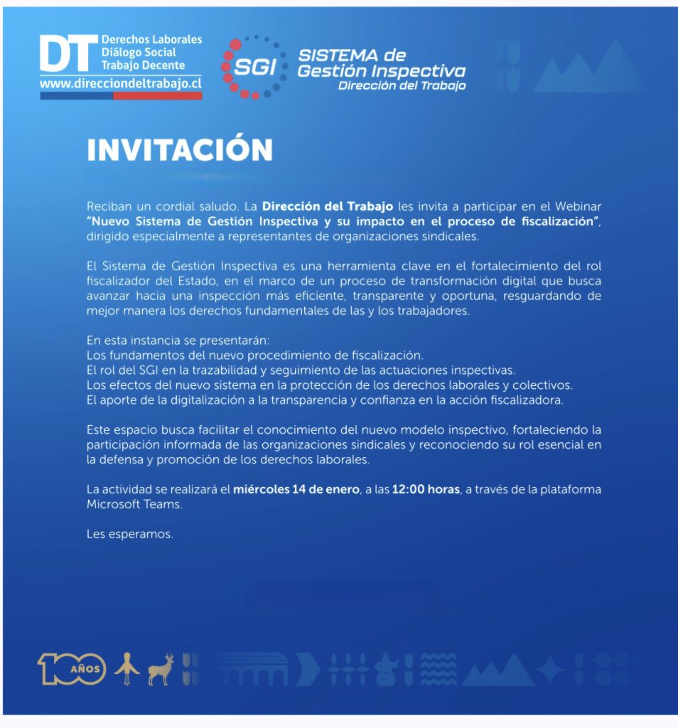 El Sindicato N°1 de Trabajadores de Huachipato asistió virtualmente al Webinar de la Dirección del Trabajo- DT, denominado Sistema de gestión inspectiva y su impacto en el proceso de fiscalización, realizado este miércoles 14 enero 2026.